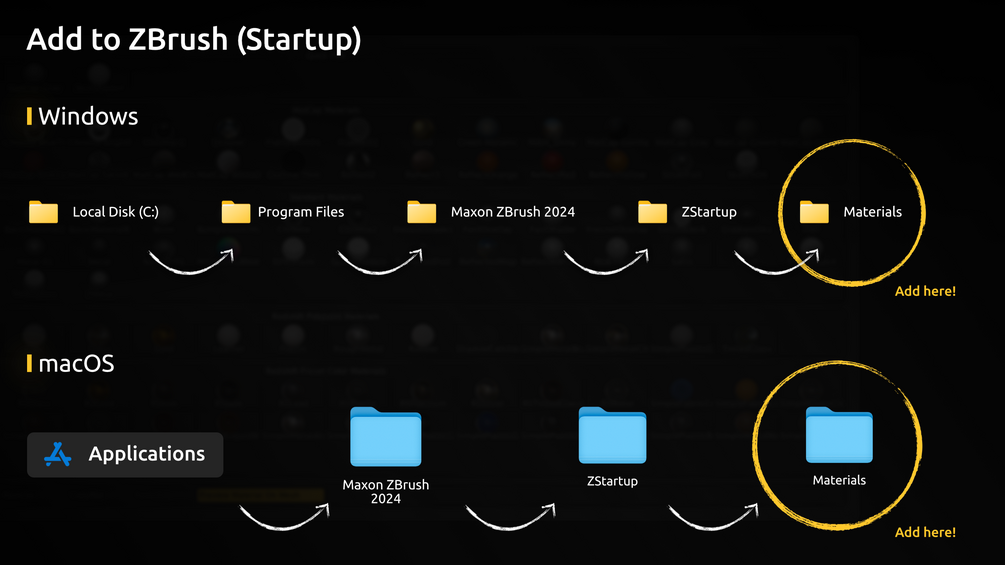 • macOS: Applications > Maxon ZBrush 2024 > ZStartup > Materials
